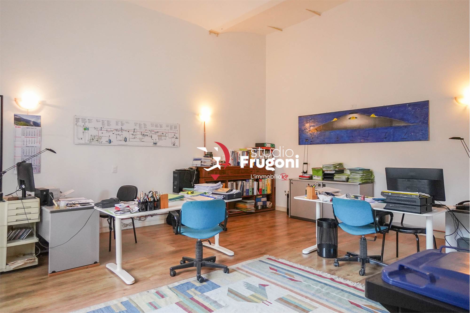 ROE' VOLCIANO - In palazzina adiacente al fiume Chiese, di sei unità,ufficio/studio al piano terra composto da grande stanza unica, attualmente suddivisa da più postazioni con scrivaniee personal computer, lungo le pareti alcune scaffalature per archivio pratiche.