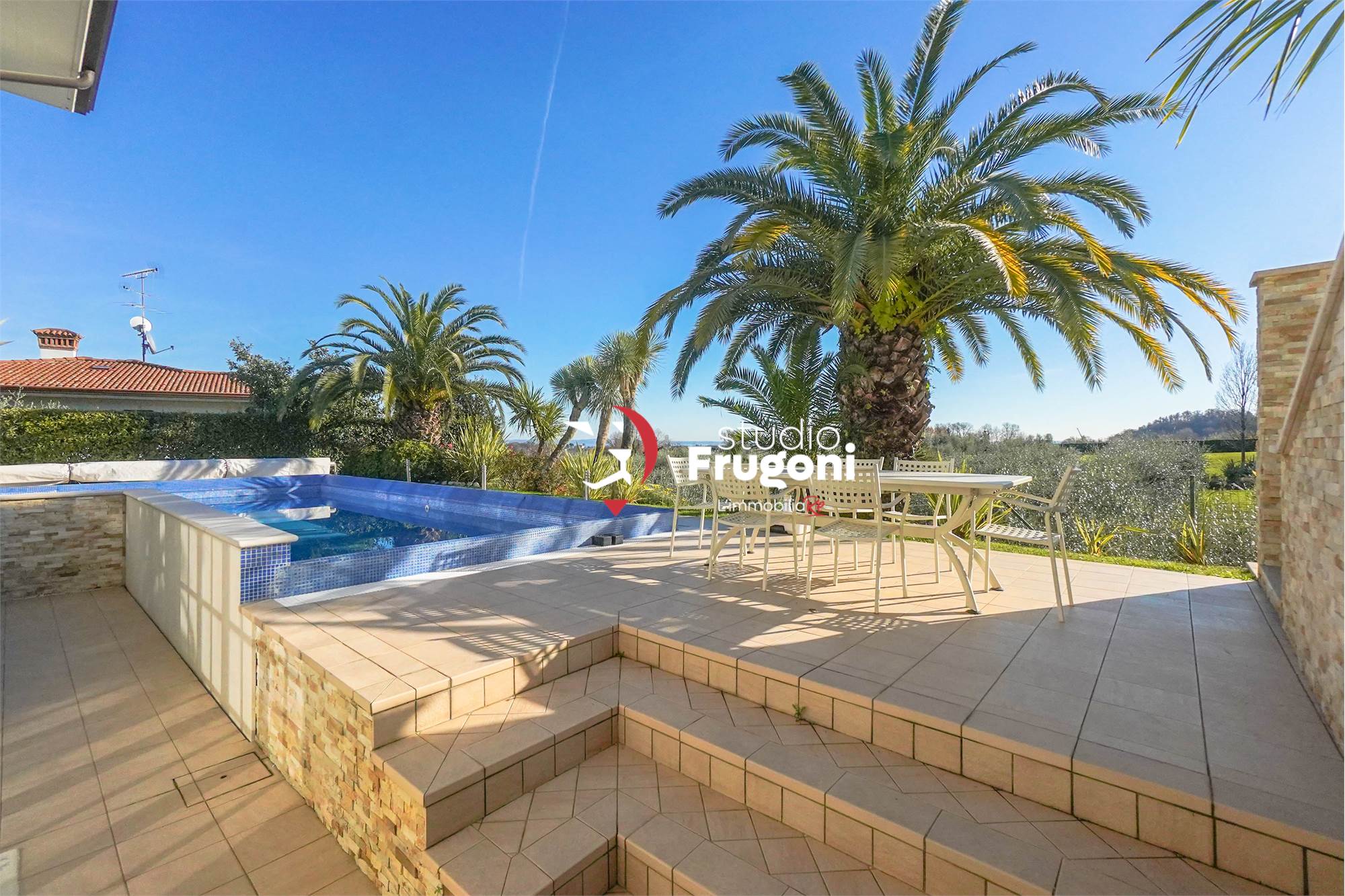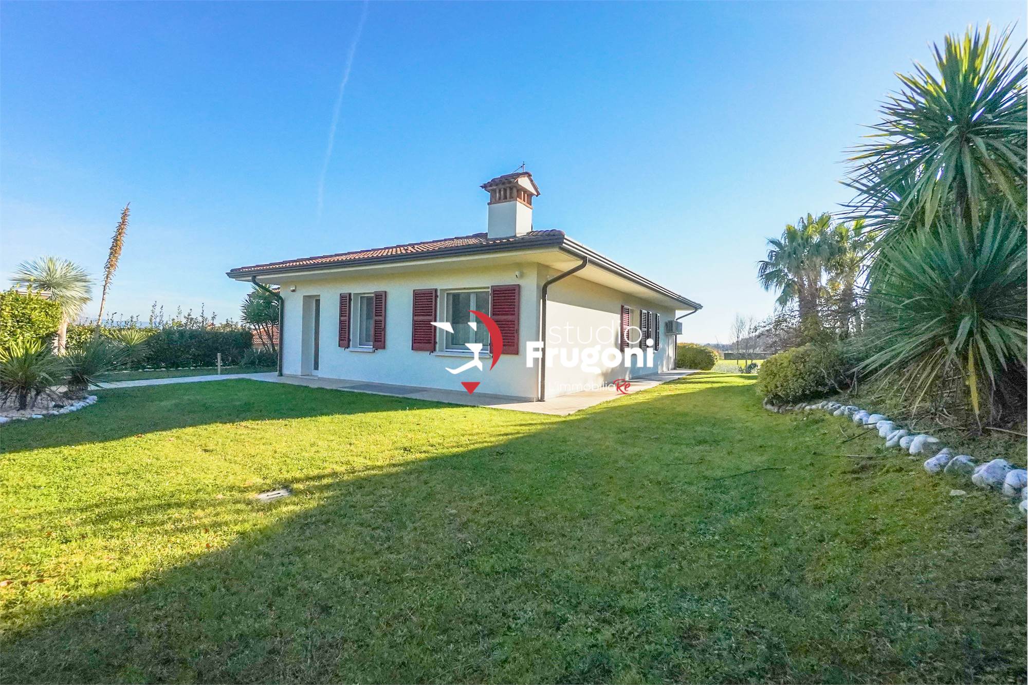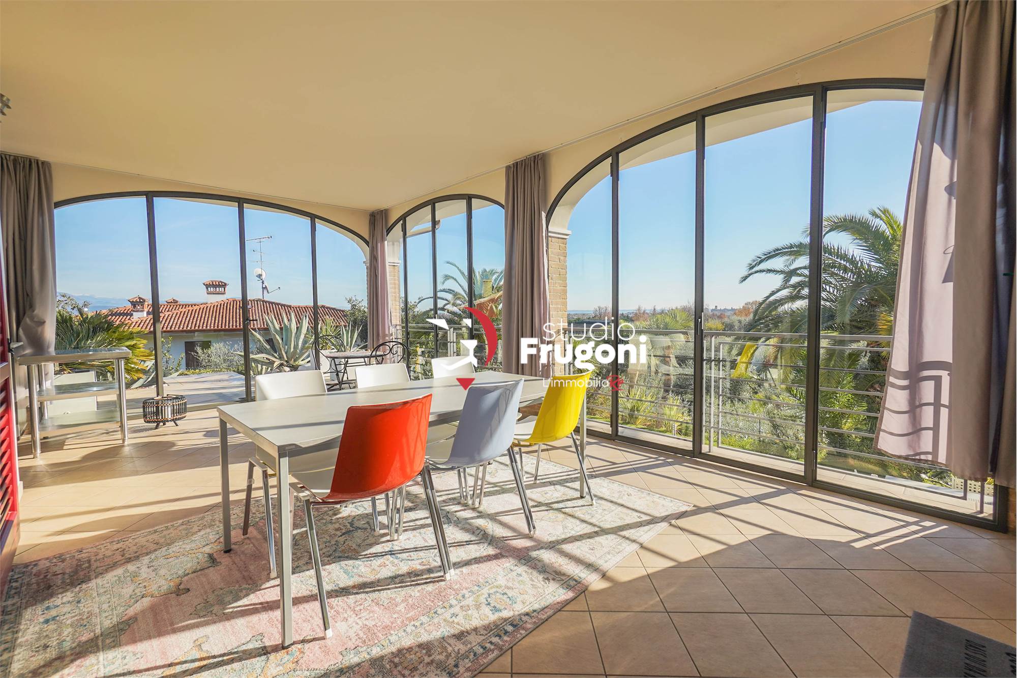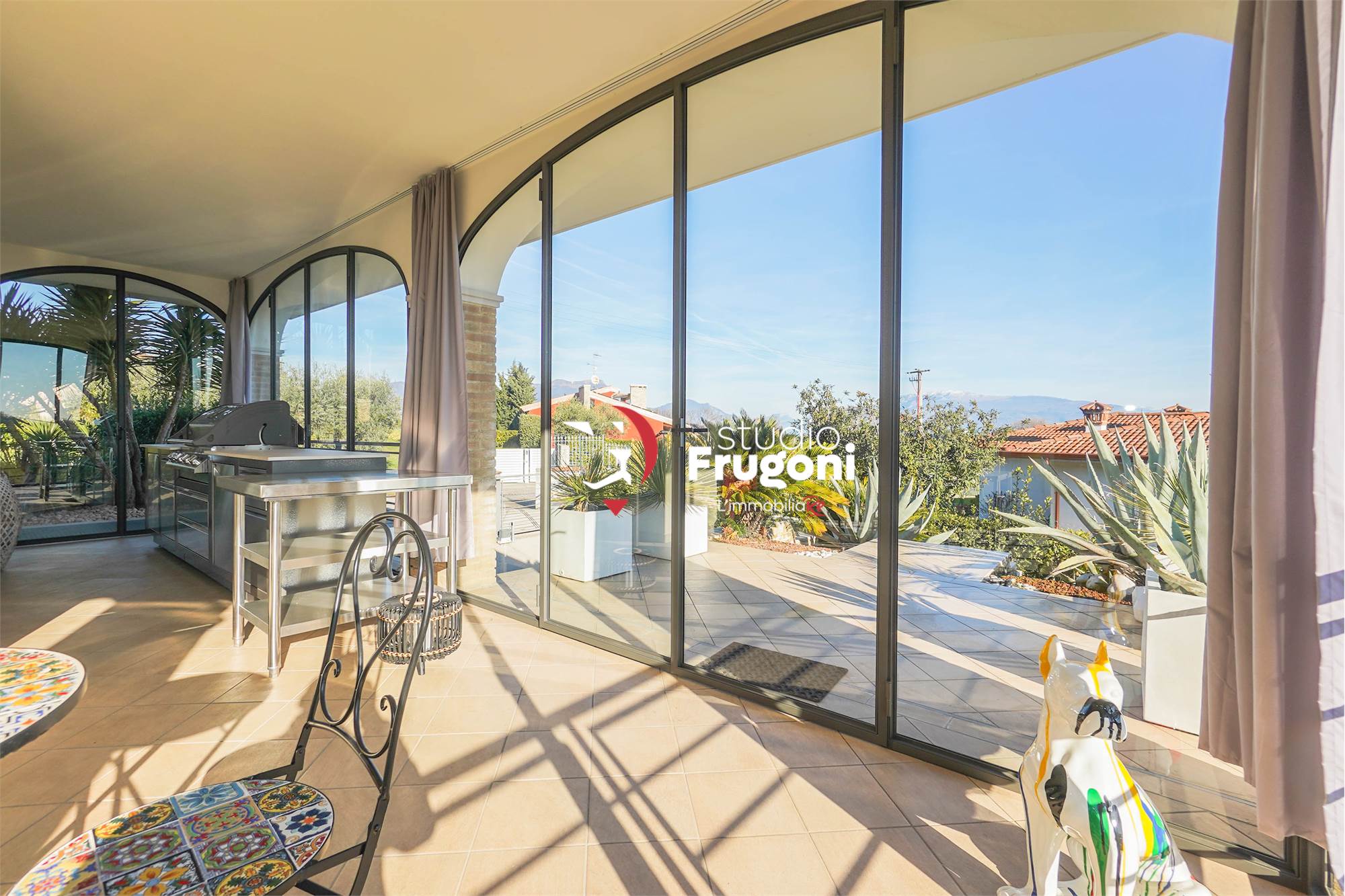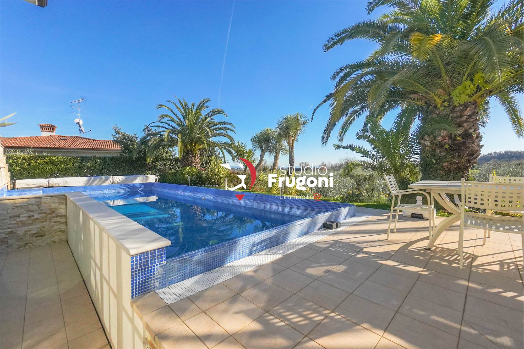 La villa è in perfette condizioni di manutenzione, con molta privacy, in posizione priva di ogni disturbo, con un affaccio panoramico sul lago e sui paesaggi collinari e caratteristici della Valtenesi (confina con uno splendido uliveto). Si dispone su di un unico piano, la zona giorno, sala ampia con cucina separata si collega ad un ampio portico con veranda; al piano sono presenti due camere matrimoniali ognuna con il proprio bagno privato, uno studio- camera ospiti, un bagno di servizio.